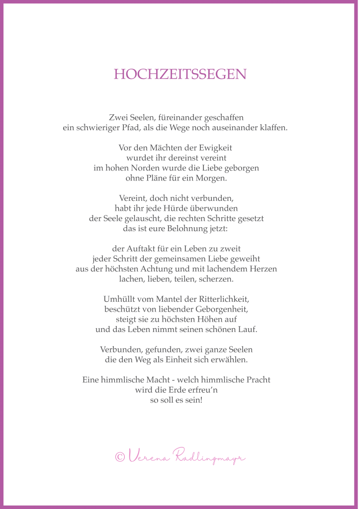 „Als wir uns über unsere Hochzeit Gedanken machten, wollten wir etwas ganz Besonderes. In diesen Worten haben wir es gefunden. Danke, Verena, Du hast unseren Hochzeitstag zu etwas noch Schönerem gemacht.“